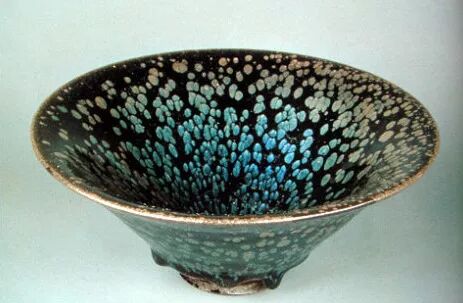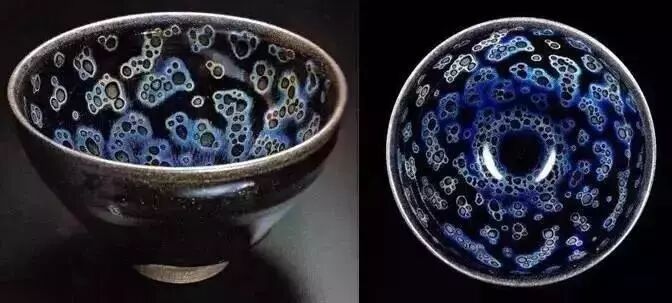 曜变盏内外,黑色釉面上呈现大小不等的圆形或近似圆形的斑点,斑点的分布并不均匀,几个或几十个聚在一起,经光线照耀,斑点的周围有眩目的晕彩变幻,呈现蓝、紫红、金黄等色,璀璨相映,珠光闪烁,属建窑绝品。