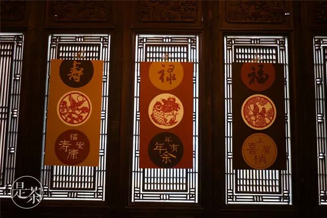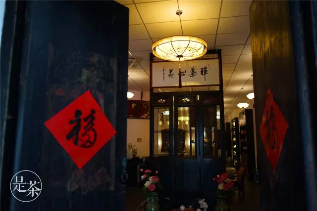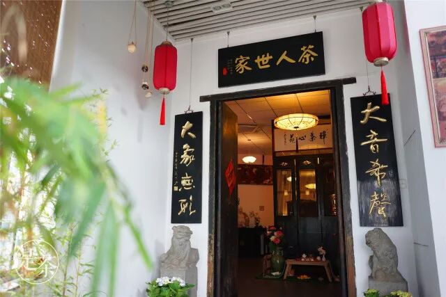 走上二楼,一拐角,「茶人世家」便立马映入眼帘,黑漆金字的匾额、两边上悬的红灯笼、整体古朴有年代感的木门、轻扣的铜环、两边对称摆放的石狮,每个要素无不凸显出东方式的空间感。