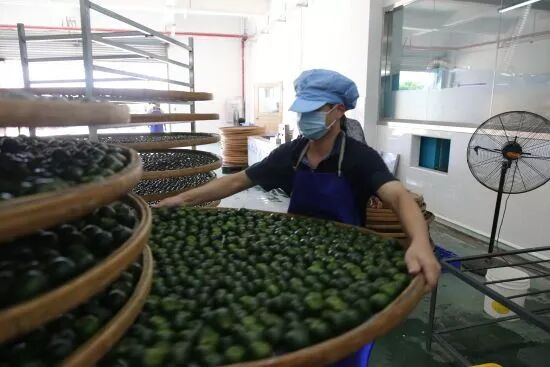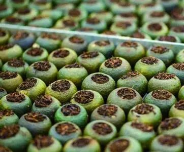 想要产生“白霜”,必须要保证小青柑表面油囊的活性,小青柑的油囊一旦遭到破坏就难以产生“白霜”,小青柑的价值也随之降低。如果想保证油囊的活性及完整性,只能通过反复日晒和低温长时间烘焙的工艺,小青柑表面才会析出“白霜”。