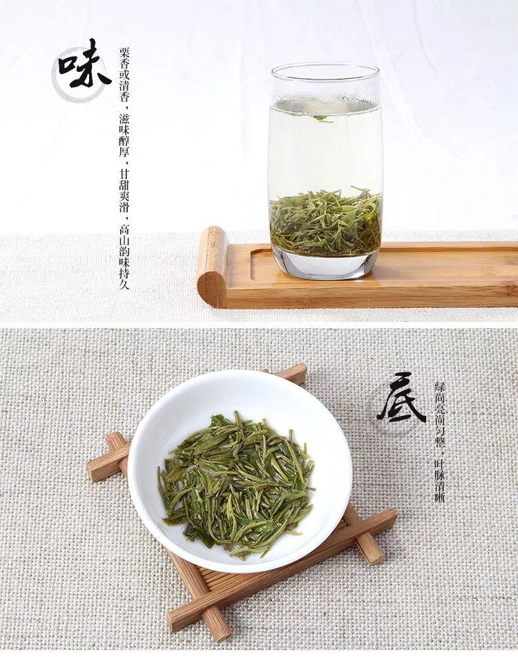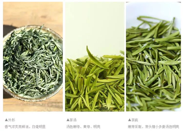 条索细、紧、圆、直,色泽翠绿,白毫显露;汤色清绿明亮,香气鲜高,滋味鲜醇;叶底芽壮,嫩绿匀整。素以“色绿、味鲜、香高”著称。