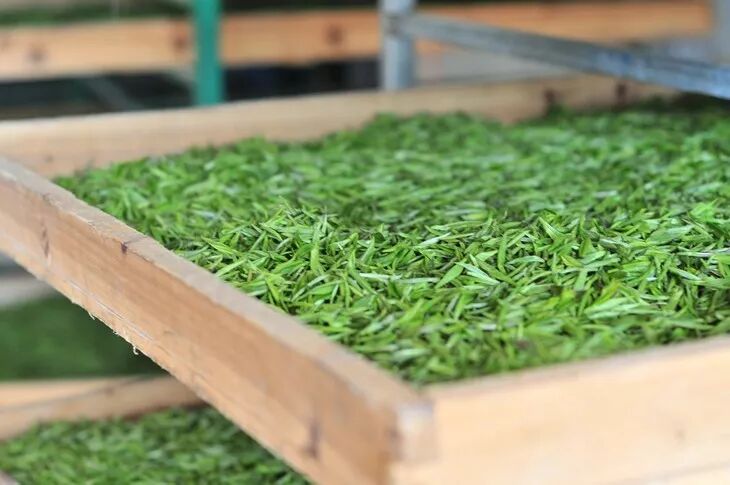 在采摘中,更是要轻轻向上提采或折断,务必要达到:嫩、细、匀、整、净等特点。之后分级验收,分级摊放,分级炒制。