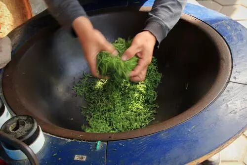 而相比采摘,制作工艺就更难上加难了。而信阳毛尖的精髓却在这里。传统的工艺要将毛尖按照生锅、熟锅、烘焙、拣剔的步骤进行。这生熟锅就是信阳毛尖的一大特色了。两锅均使用直径半米还多的大铁锅,以一个斜度安放在矮锅台上,生锅和熟锅要相连砌置。