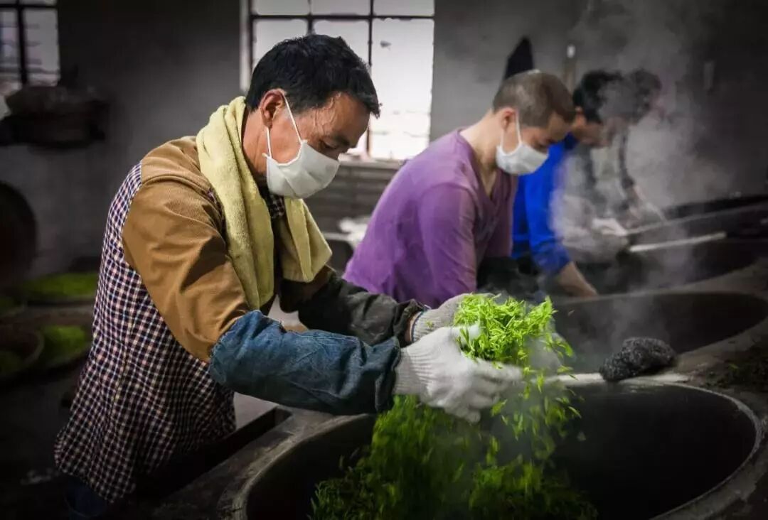 炒青:鲜叶当天摘,当天炒。坚持以木柴热锅,极为讲究火候,先烧到四百多摄氏度,回落到三百多摄氏度,鲜叶才下锅。