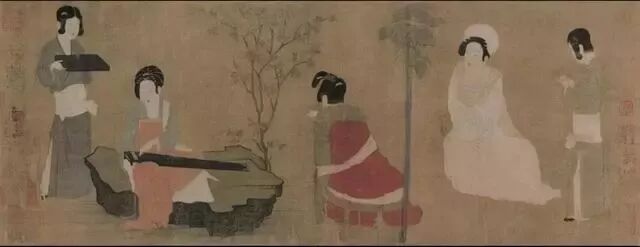 全图共有五位仕女,重点表现一位红衣仕女子在园中树边石凳上弹古琴,旁边茶女端着茶托恭候,表现了贵族妇女闲散恬静的享乐生活。