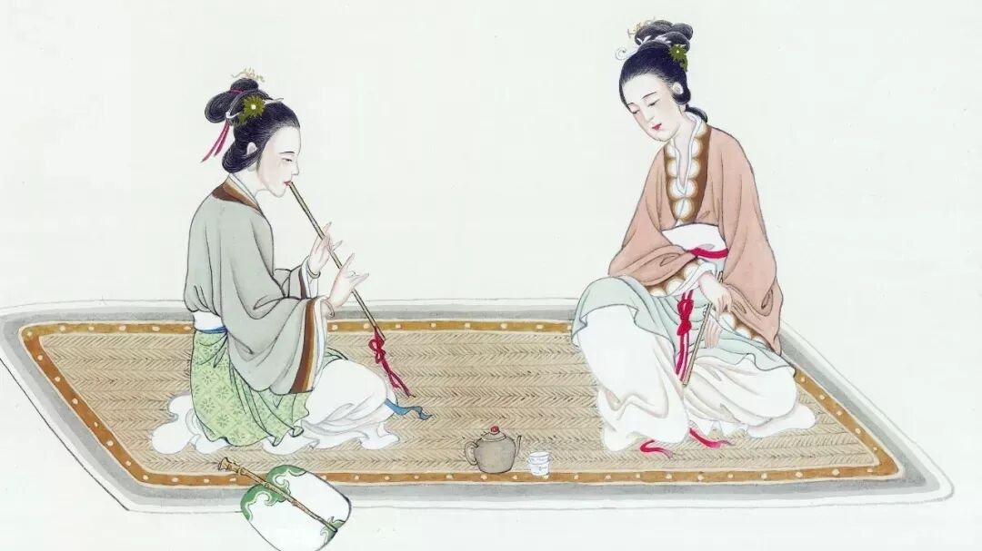 周昉著作的《调琴啜茗图》,画中描绘了唐代仕女弹古琴饮茶的生活情景