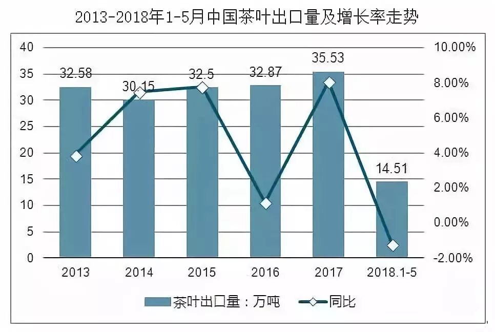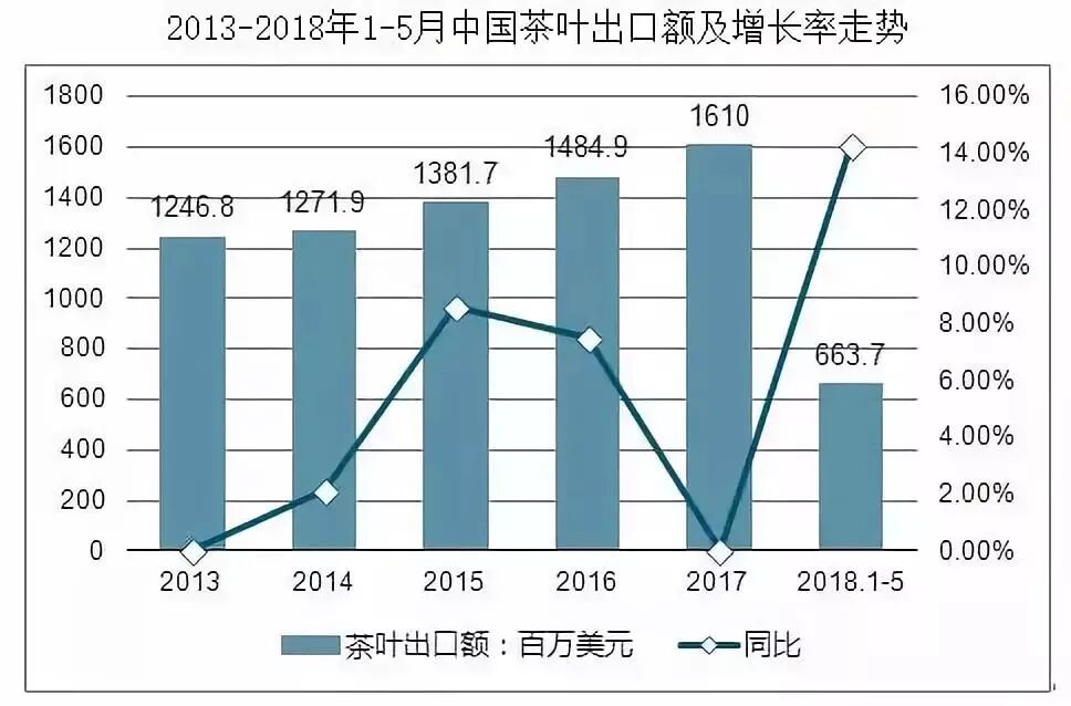 从上面两组数据图可以看出,在茶出口量方面来看,2018年1-5月,同比往年下滑。但从出口金额方面来看,同比增长幅度很大,高达14%。