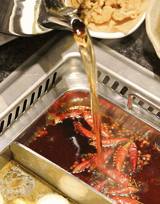 茶叶本来就是重庆火锅最传统的配料之一,厨房师傅会将四川的花椒和辣椒加入云南的普洱茶一起翻炒。在红油锅底里也加入普洱茶茶包,从而使得锅底的颜色要比普通锅底深很多,但口味没有普洱茶的苦涩感。