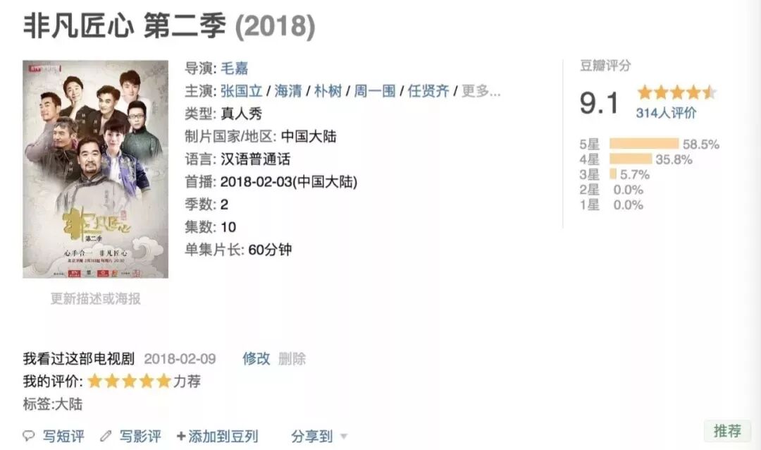 用最原始的方法来洗涤这个流量时代急躁的内心,让“一个人,一辈子,做好一件事”不再只是所谓的纸上谈兵。真心希望,之后的大荧幕上可以多一点这种“慢节奏”的良心节目,少一点炒热度、刷流量的仿制综艺。