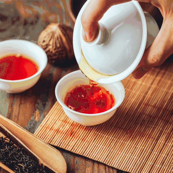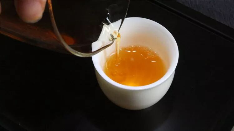 将沸水浇打在干茶上,水一下子就红了起来。
