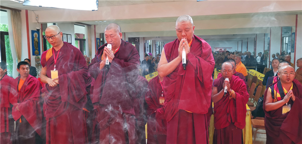 开幕仪式前,由帕松列龙庄勐、祜巴罕听、祜巴提卡达希、关加益西喜绕、让迥贡觉丹增、丹巴达杰、崇化法师、心明法师、演志法师带领云南省三语系佛教僧团“庆祝新中国成立70周年祈福盛典”,分别以三语系诵经,共同表达了对祖国的美好祝愿。