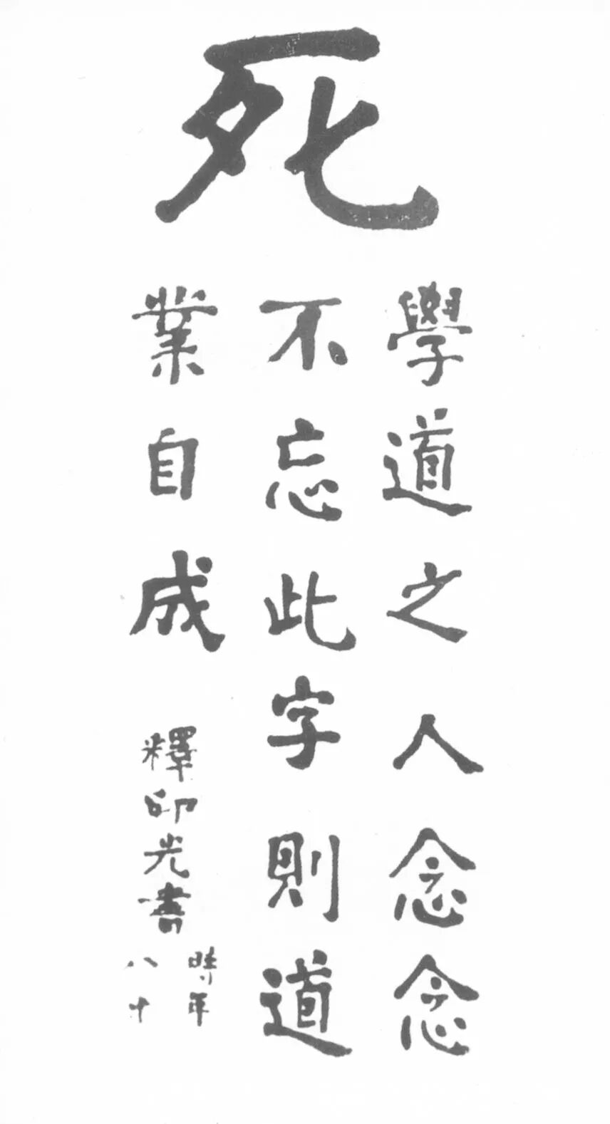 印光大师有一件常为后人称道的事迹,那便是他在房间里悬挂了一副字,上面写着一个大大的“死”字,并注解道:“学道之人念念不忘此字,则道业可成。”