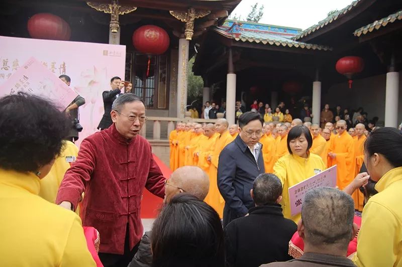 当天上午9:00,各界人士齐聚一堂,在中国佛教协会副会长、厦门市佛教协会会长、南普陀寺方丈则悟大和尚,以及定恒法师、慧然法师、界象法师、法云法师、净心法师、能元法师、世澄法师、传建法师、明德法师、法尊法师、德煌法师、弘来法师等 13 位大德长老带领下参加“新年诵经祈福法会”,并现场为义卖的书画作品开光洒净,共同祈愿世界和平、国家昌盛、厦门人民幸福安乐。