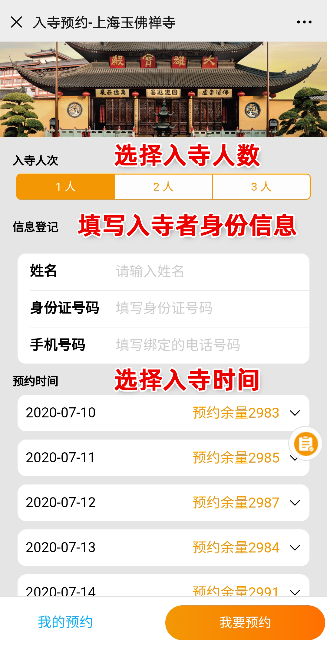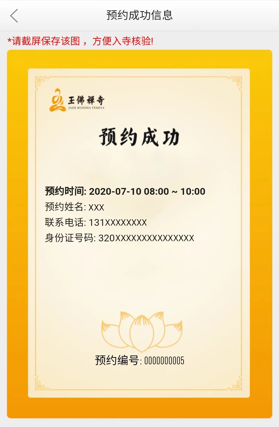 为坚决贯彻习近平总书记重要指示精神,落实党中央、国务院和上海市委、市政府关于统筹推进疫情防控和经济社会发展的部署要求,建立与疫情防控常态化相适应的宗教活动场所运营秩序,满足信教群众合理必要的宗教生活需求,并根据市民宗局《上海市宗教活动场所疫情防控工作指南》和普陀区民宗办《关于做好我区宗教活动场所有序开放相关工作的通知》的要求,上海玉佛禅寺积极做好有序开放的各项准备工作并按程序报批有关部门。 接上级有关部门通知,并经寺院讨论研究决定,上海玉佛禅寺自2020年7月10日起有序恢复对外开放。 为确保安全有序开放,玉佛禅寺将严格执行疫情防控的各项措施,安排工作人员对广大信众和游客的入寺信息进行核验,现将有关开放事项作如下通告: 一、自2020年7月10日起,玉佛禅寺每日开放时段为8:00—16:00。 二、请提前通过扫描“上海玉佛禅寺入寺预约码”,完成实名预约登记。 三、入寺请向工作人员出示实时“随申码”和预约成功的凭证,“随申码”显示为绿色,方可进入寺院。 四、入寺请主动配合工作人员“测体温”,拒不接受体温测量或体温异常者,谢绝入寺。 五、入寺参访、礼佛请全程佩戴口罩,听从工作人员的安排和指引,保持间距,文明敬香,有序参观。 六、为避免人群聚集,文殊殿、普贤殿公益抄经暂不开放。 七、游览、礼佛结束后,请及时返回,勿在寺内逗留。 八、玉佛禅寺暂不接待旅行团入寺游览。 按照党中央决策部署,宗教团体要全面落实“外防输入、内防反弹”的总体防控策略,始终绷紧疫情防控这根弦,严格落实疫情防控措施,敬请广大信众、游客朋友们理解、支持和配合。上海玉佛禅寺