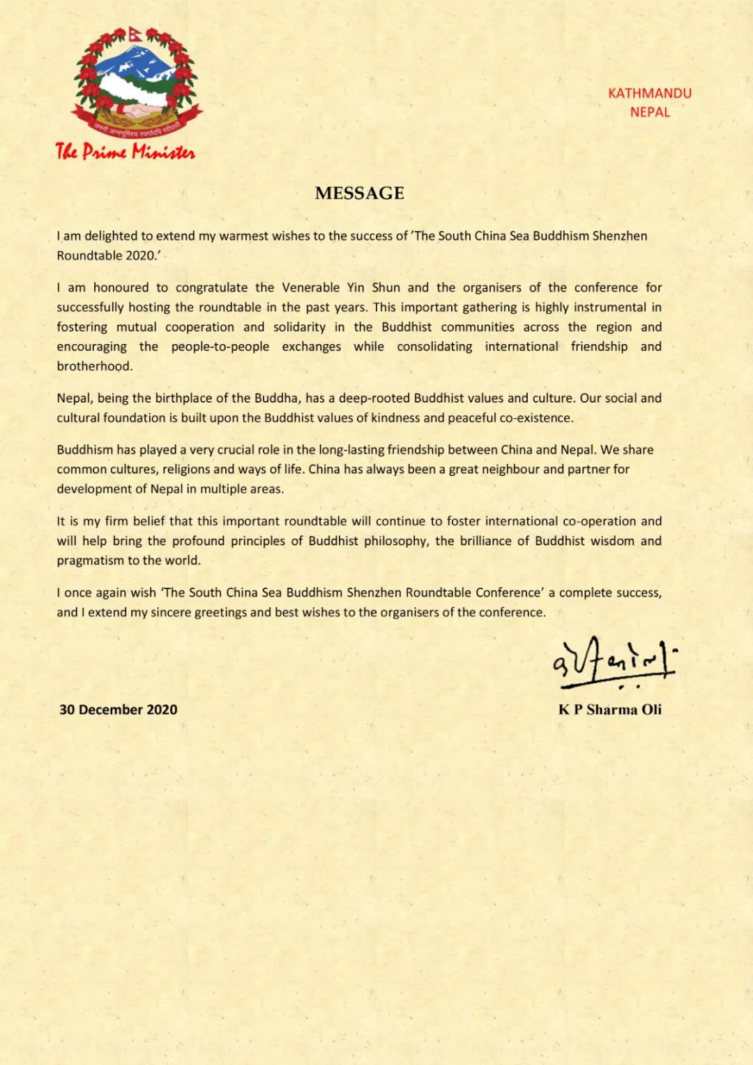 斯里兰卡总理马欣达·拉贾帕克萨向大会致贺信,他表示,南海佛教深圳圆桌会的崇高目标就是反对暴力、促进和平,相信本次会议将增进区域内人民福祉,促进开放心态,促进和平与和谐。中国全国政协副主席何厚铧在贺信中表示,南海佛教深圳圆桌会自举办以来,凝聚了南海地区佛教界力量,在促进地区和平稳定发展,助力“一带一路”倡议,推动粤港澳大湾区建设,构建人类命运共同体等方面做出了积极的贡献。本次大会也收到柬埔寨副首相棉森婉等国际政要发来的贺信。