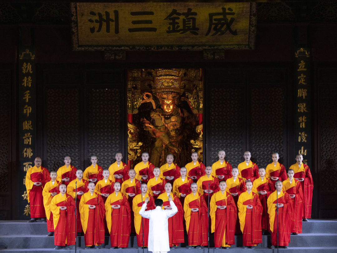 川腔梵呗,又称上江腔梵呗,是吸收了长江中下游十方腔梵呗唱诵,以四川方言为基础,极具巴蜀地域性风格。由正在参加中国佛教讲经法师高级研习班的学员演唱的《香焚在上方》,是川腔梵呗中颇具代表性的赞呗,因其唱词短小明快而常用于各类祝圣、祈福等法事活动,其清扬明丽、婉转灵动的风格也集中体现了川腔梵呗唱腔特点。