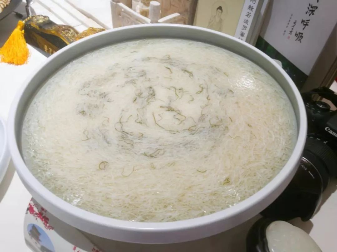 五祖寺斋堂在继承传统制作方式的基础上结合现代烹饪美学,选用亮白鲜嫩的内脂豆腐,以神奇刀工将主材与辅材均切成如发细丝,将锅中加入适量水,然后加入调料,再倒入豆腐丝,以文火烹煮,并朝一个方向慢慢绞动,待沸后再加入发菜与青菜丝勾芡装盘。