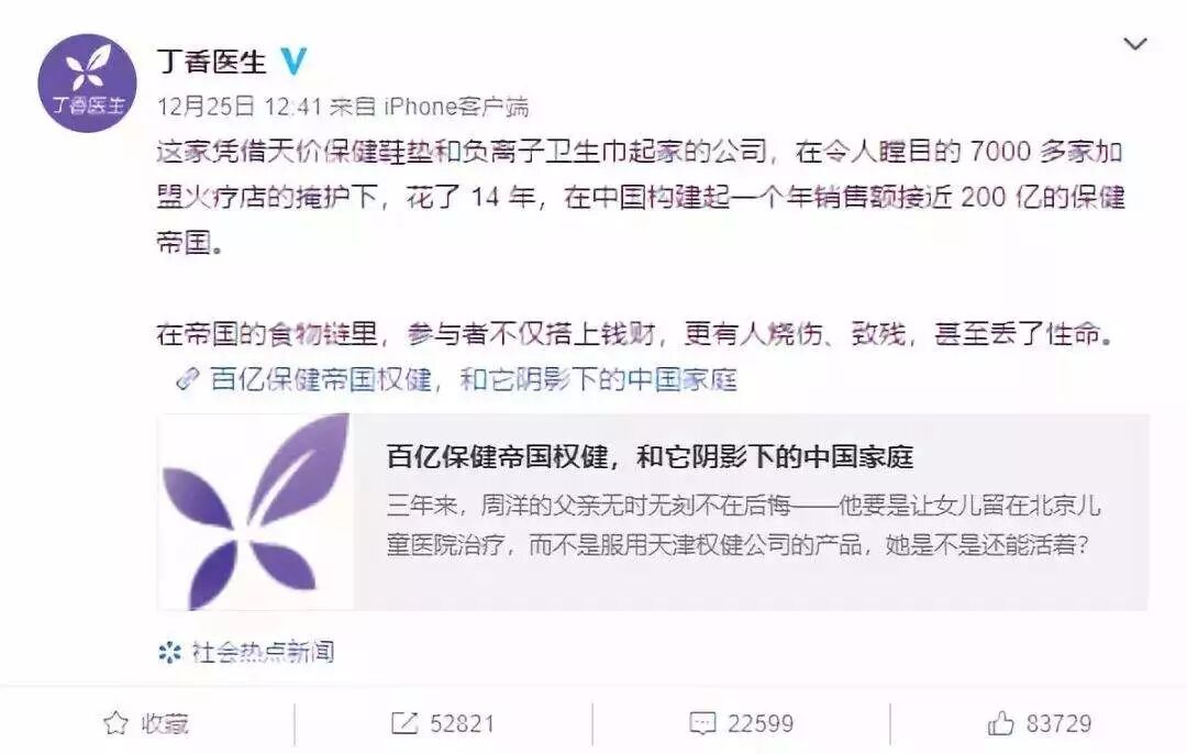 引发权健事件的导火索,无疑便是丁香医生的那篇《百亿保健帝国权健,和它阴影下的中国家庭》了。