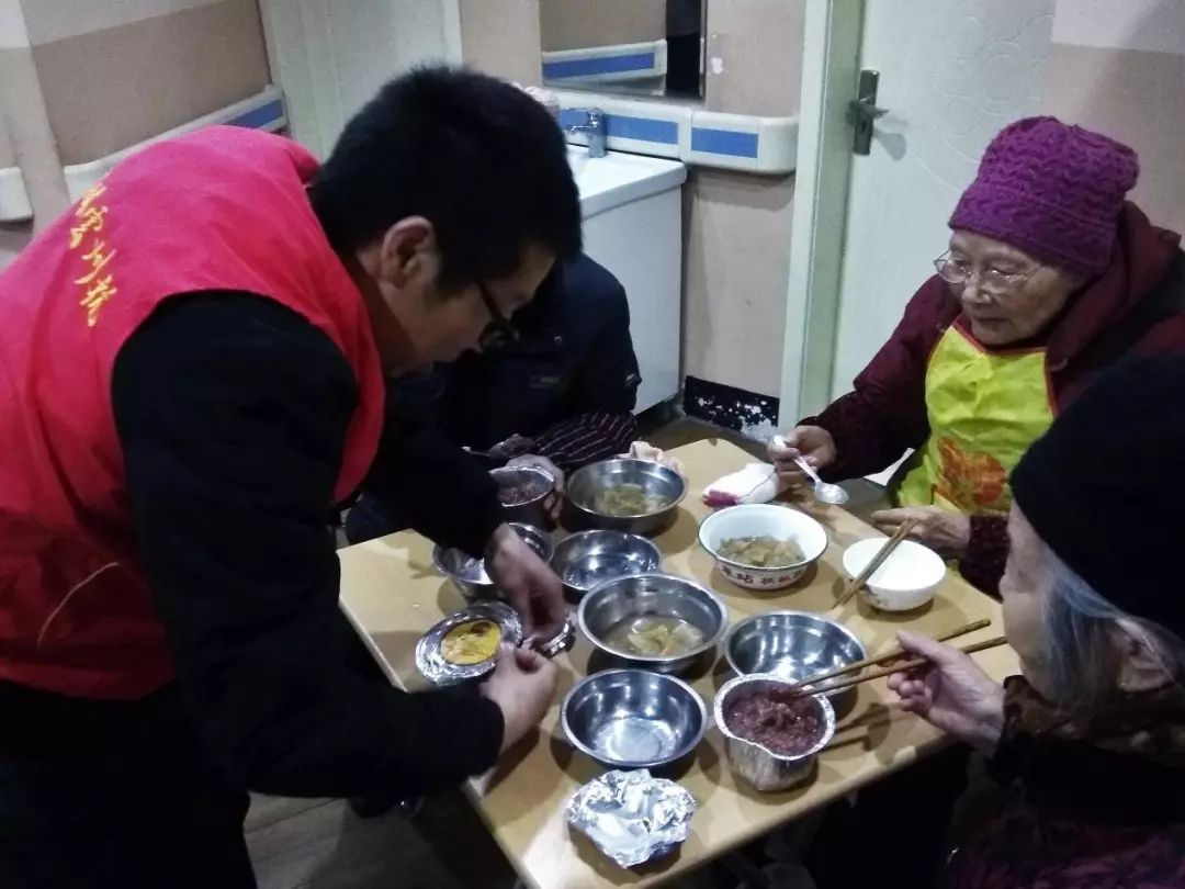 转塘敬老院的老人们,有的还躺在床上。志愿者们一个个房间来回穿梭,把腊八粥送到每一位老人手里。