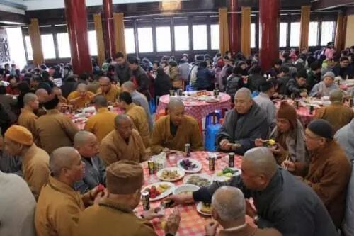 终于开饭了。师父先作了一个简短的致辞,感谢大家一年来对寺庙的关心、支持,并对大家给予良好的祝福。话音落定,大家就动起手来。