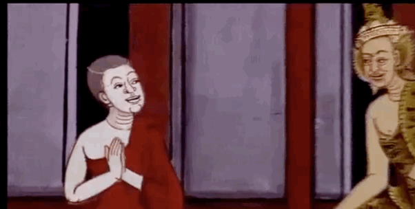 一个星期之后,一个名叫阿私陀的圣者来到王宫造访。他是从高山上的住处拄着手杖下山前来的,因年老而弯着身子。