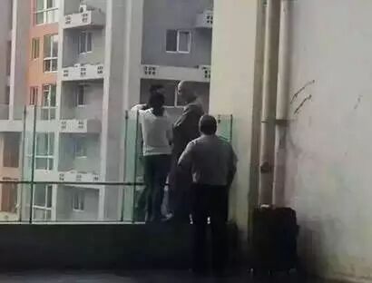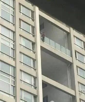 看到男孩情绪稳定下来,法师趁机踩到玻璃护栏的钢管上,一把抱住男孩的腰部,将他从玻璃墙外拖进楼内。