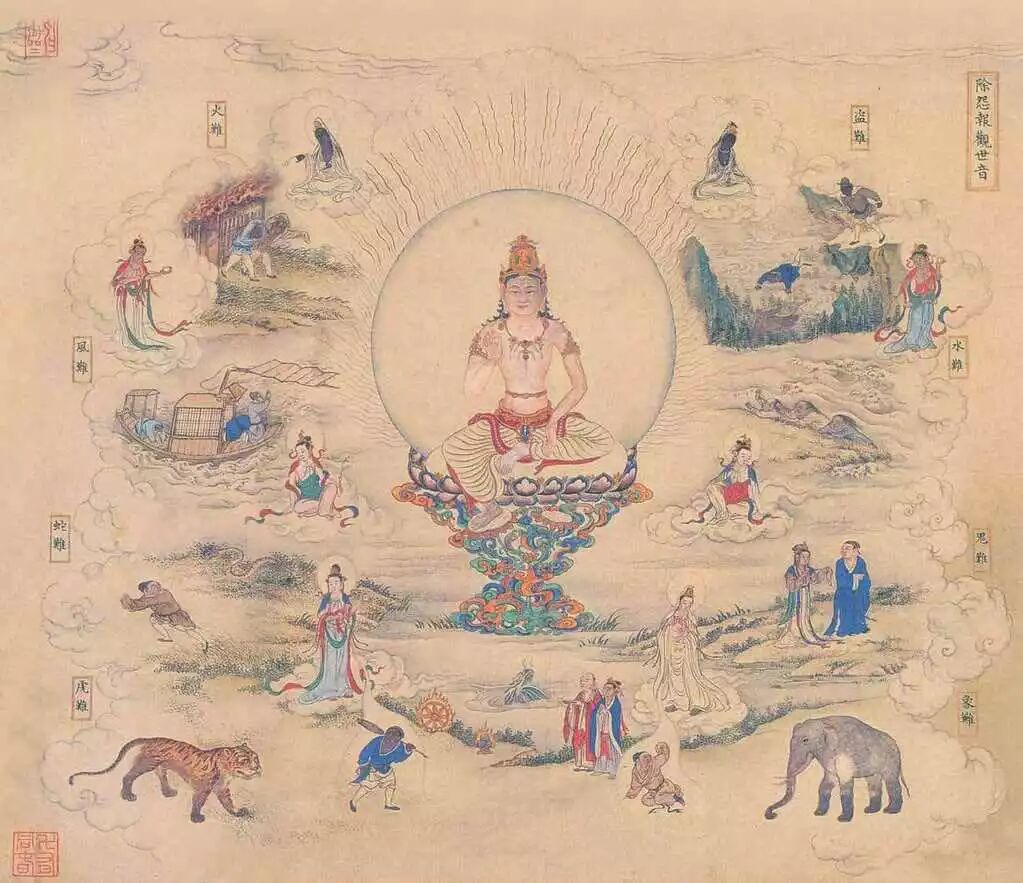 《普门品》中其实反映的就是,刀兵、水火、盗贼、猛兽乃至被拘捕受困,这种种令人感到自身有受损之虞的情况,都会引发人们的恐惧。