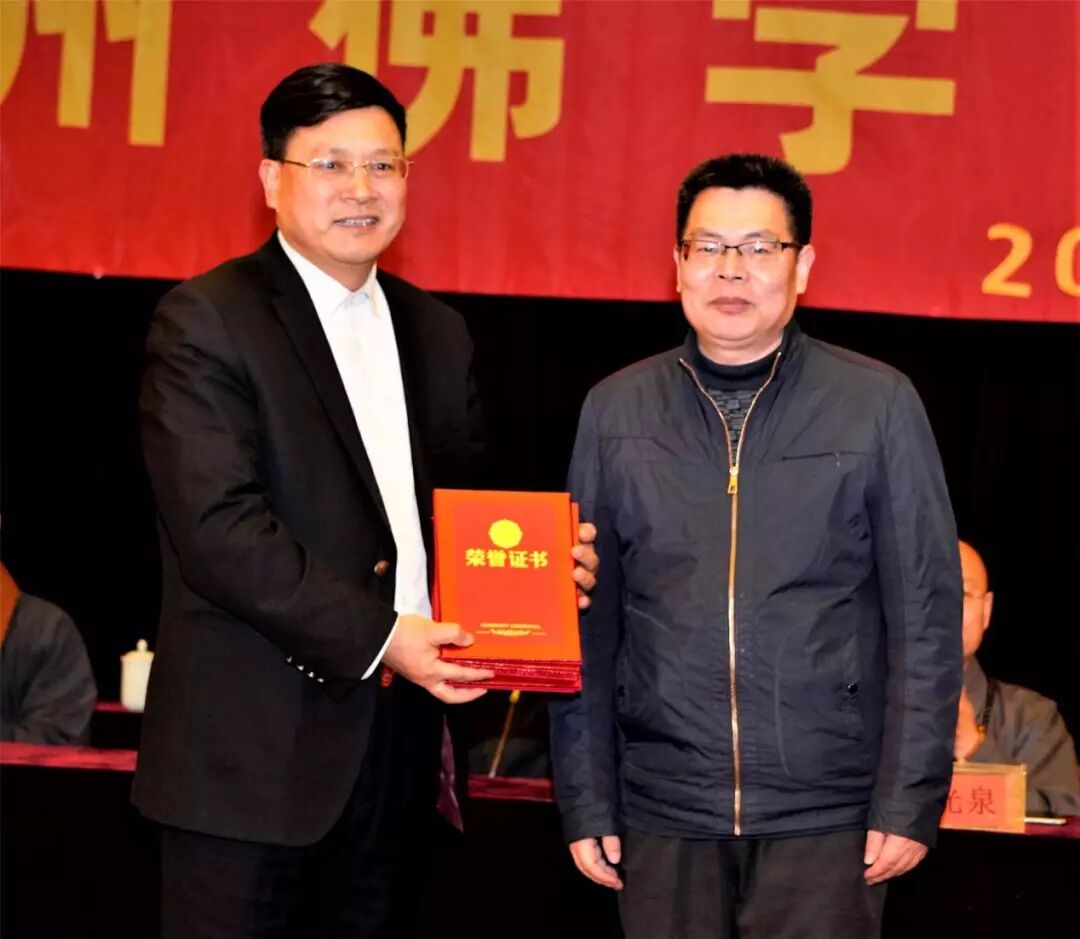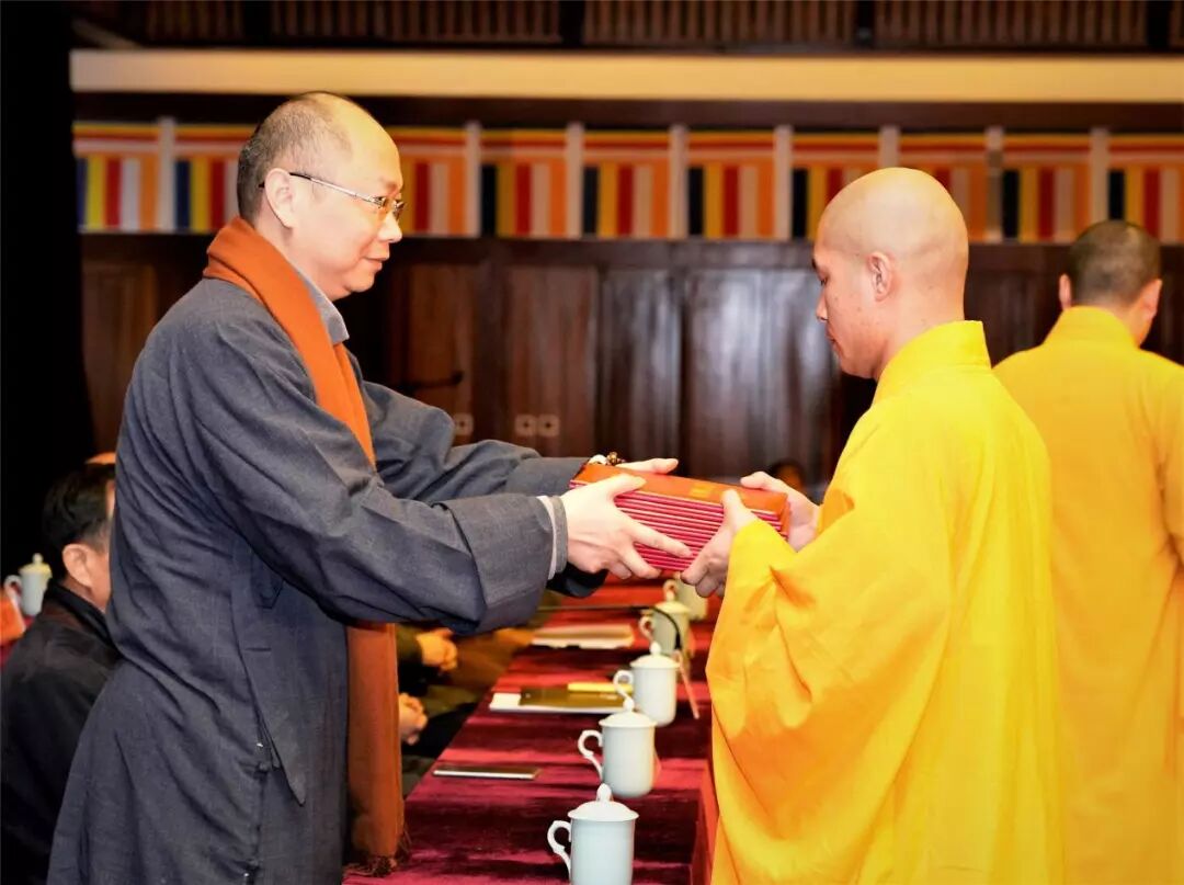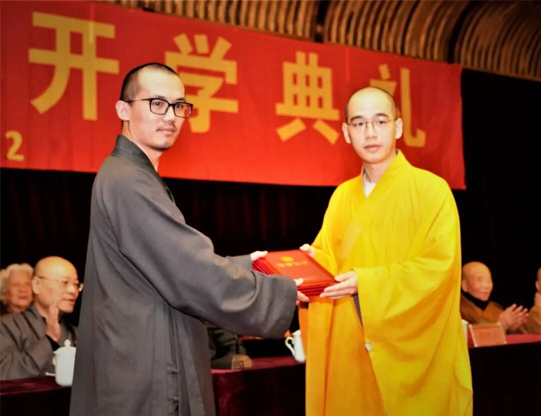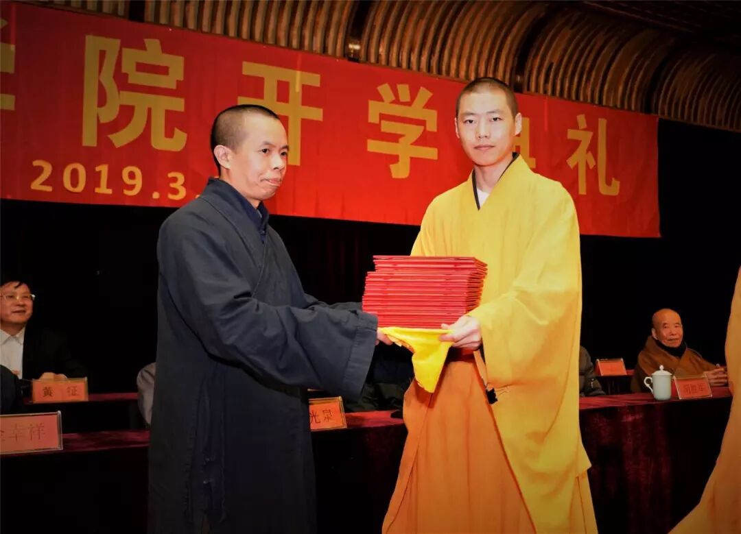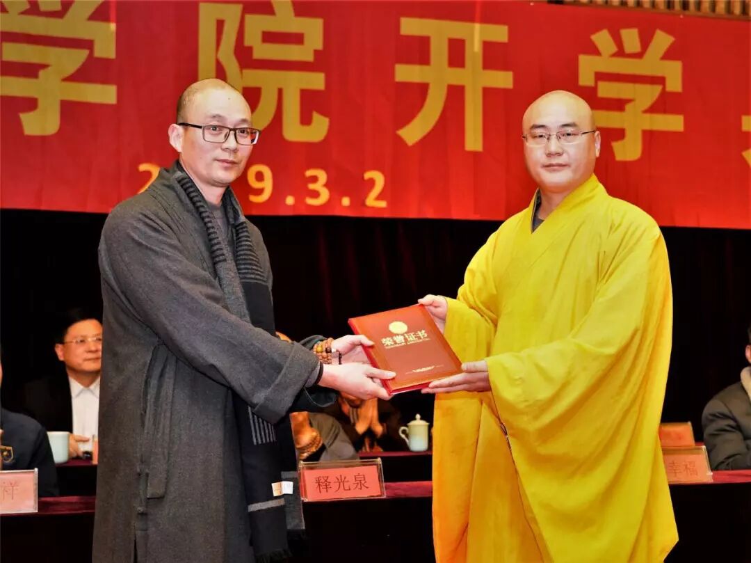 浙江省民族宗教事务局宗教事务委员会副主任莫幸福要求杭州佛学院坚持正确的办学方针。一是坚持正确的方向,正确政治方向,正信的佛教方向;二是继承优秀的传统,继承佛教优秀传统,中华优秀文化的传统;三是学思结合,学用结合,知行合一,践悟道业,担当有为。 在开学典礼上,光泉院长为2018届毕业学僧颁发了毕业证书;为两名学士学位获得者颁发学位证书;为六名硕士学位获得者颁发学位证书。 开学典礼为2018学年36名优秀毕业学僧颁发了奖学金。此次奖学金由北高峰灵顺寺、上天竺法喜寺、永福寺、中天竺法净禅寺和南山讲寺提供。 毕业学僧代表广鹏法师、新入学学僧代表念行法师致答谢词。在开学典礼宣读了杭州佛学院的“常聘教授”名单并颁发聘书。“常聘教授”代表浙江大学哲学系教授浦永春致辞。 杭州佛学院宏慧法师和存德、纪佩珍、莫玮老师等四人获得2018年度优秀工作者荣誉称号。杭州市民族宗教事务局宗教处处长胡胜军向优秀工作者颁奖。 在杭州佛学院建校20周年之际,诸多艺术家参加“杭州佛学院建校20周年艺术展”。开学典礼对60多位参展艺术家进行表彰,浙江省民族宗教事务委员会副主任莫幸福颁发证书,并向捐赠书画的5位艺术家颁发了荣誉证书。