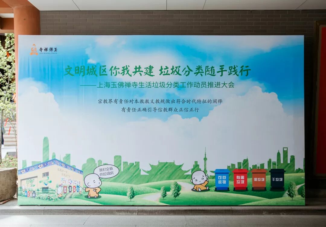 上海玉佛禅寺在积极响应政府的垃圾分类政策过程中,从佛教经典入手,释义“随其心净,则佛土净”,希望从心灵的净化推广到生活环境的净化,进而推动整个生态文明的建设,并以实际行动向全市宗教界发出倡议,希望在垃圾分类工作中积极引导信众的正信正行,将垃圾分类的理念从寺院传递给信众,从玉佛禅寺传递到上海的各个佛教寺院,乃至其他的宗教场所。早在上世纪90年代,上海玉佛禅寺就十分注重环保和资源的再利用,前任方丈真禅法师提出了文明敬香的理念。如今,为了积极宣传环保理念,让资源可循环的理念深入人心,上海玉佛禅寺积极开展垃圾分类活动。寺内的公共区域放置了多个“垃圾三分法”垃圾桶,上面标有中、英、日三种语言文字说明,希望引导寺院的信众和游客以实际行动自觉践行垃圾分类。此外,玉佛禅寺还在有关部门的指导下筹建了一处40到50平方米的垃圾房,用于回收处理分类好的垃圾。