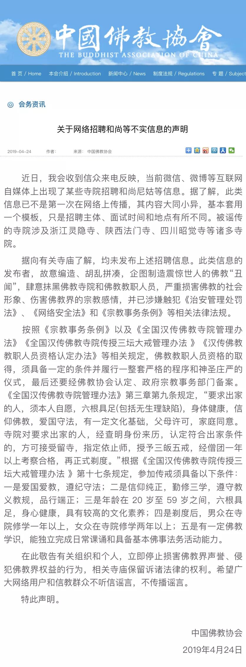 (中国佛教协会官方声明截图)