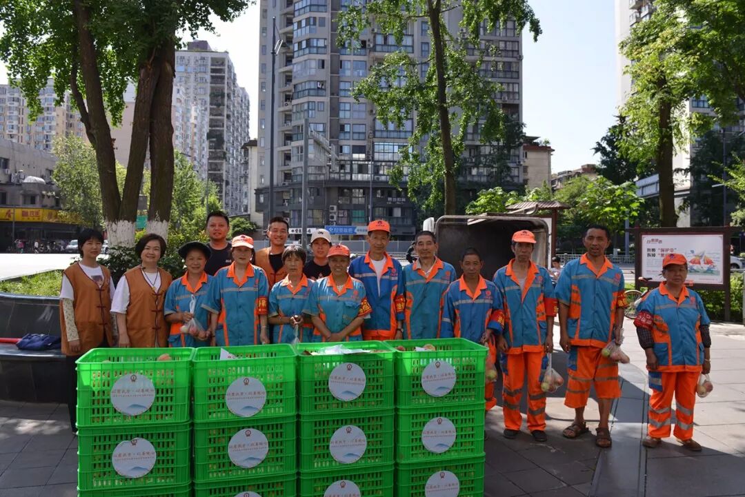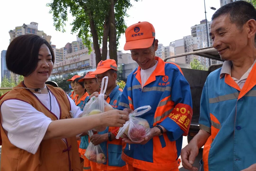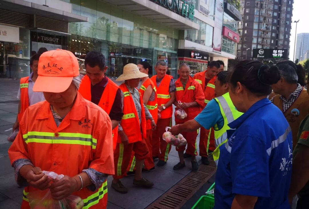 除了为老人们送“寿桃”,志工们还为新华西路街道办事处环卫公司及草市街街道办事处环卫公司的310名环卫工人奉桃。一千多斤经过精心挑选的水蜜桃,被志工们分别装袋,并亲切地交到工人们手中。不少工人还嘱咐:“要给这会儿不在的工友们留一些!” 烈日炎炎,是对身心巨大的考验。为环卫工人们送上这份“甜蜜”的祝福,希望他们少些烦恼,长存喜悦。