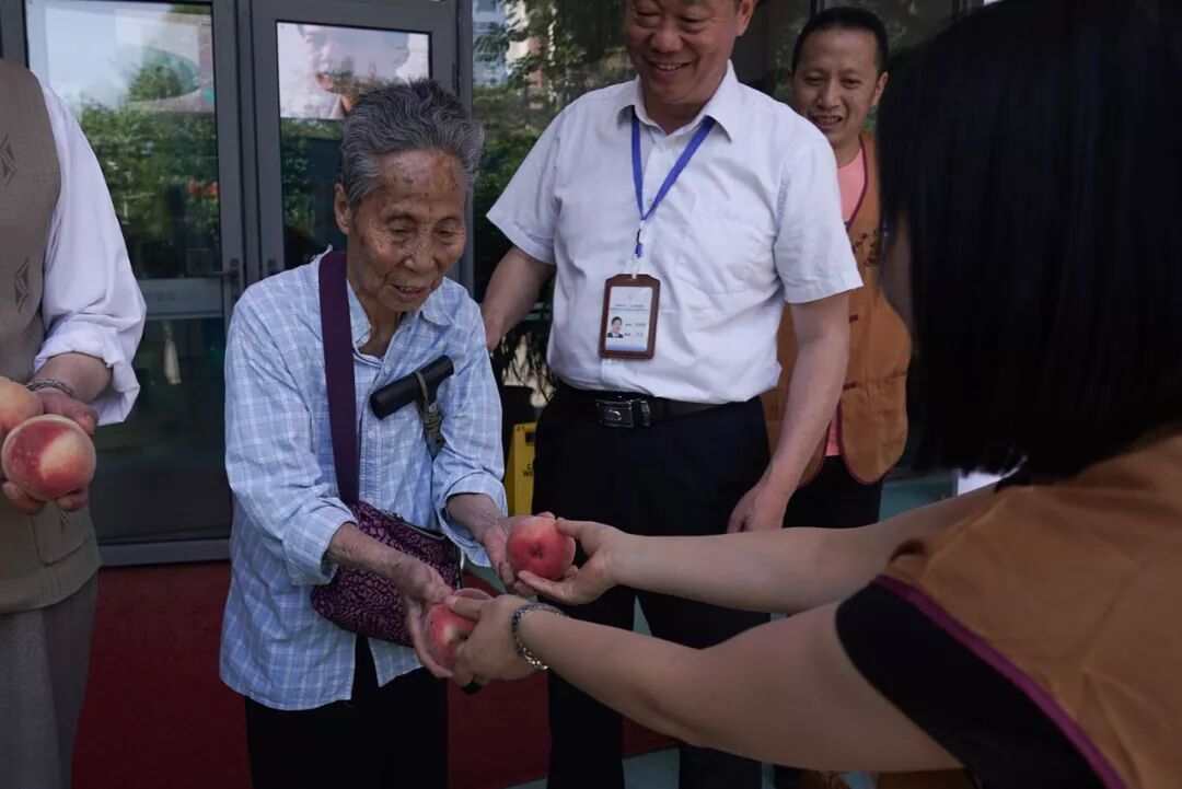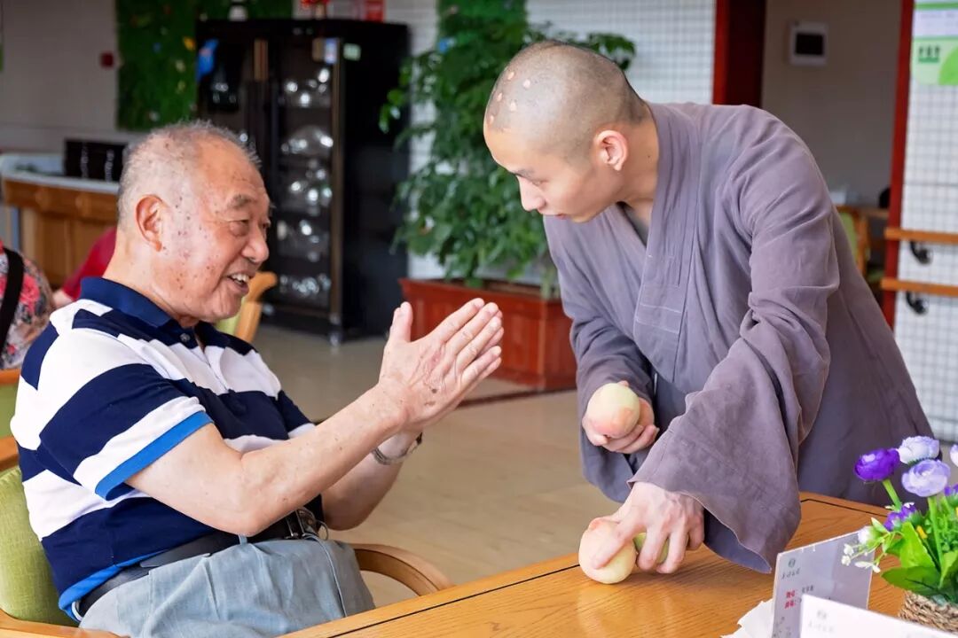 端午节的意义对老人来说,更多在于“陪伴”。通胤法师带领志工走遍每个房间,亲手向每位老人奉桃,并送上节日的祝福。虽然有的老人失能、失智、行动不便,但当法师亲切地关心他们、一起互动时,欣喜的脸上仿佛有了儿时的快乐。一位行动不便的老人,激动地回忆了自己从小在文殊院玩耍长大的故事,最后仍不忘感谢文殊院上一代方丈的慈恩。为表感谢,精通川剧的张奶奶还为法师及志工献唱了《杜十娘》的精彩片段。临别时,法师祝福老人们:“保重身体,保持好的心态,长命百岁、端午安康!”
