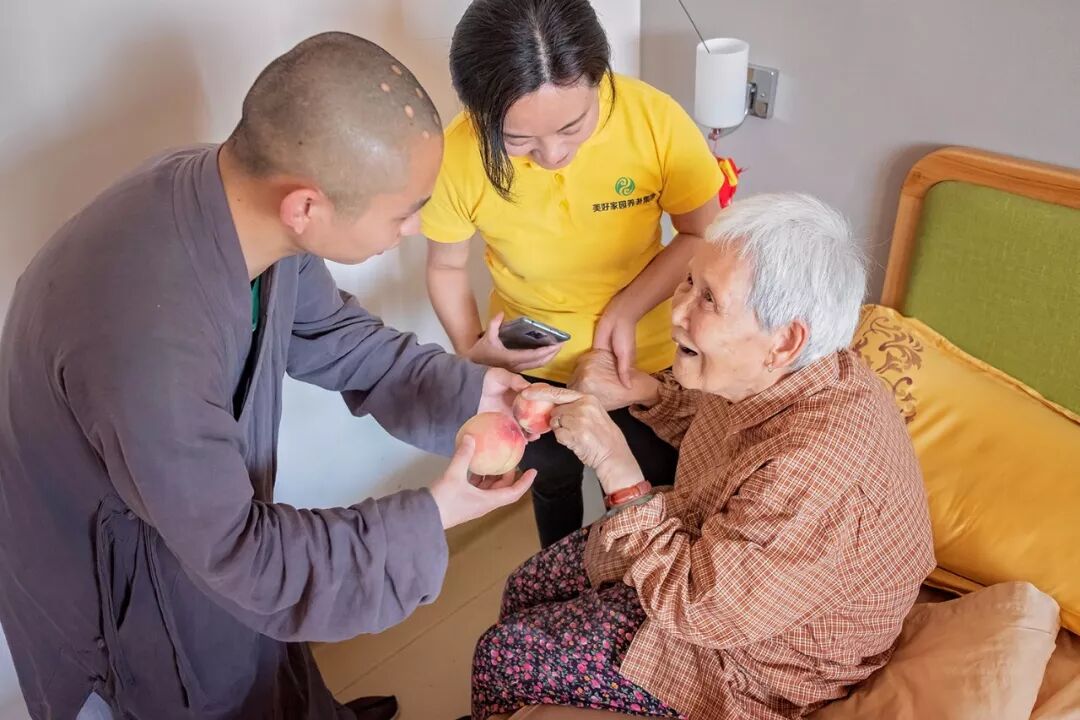 ▲法师奉桃,老人感恩