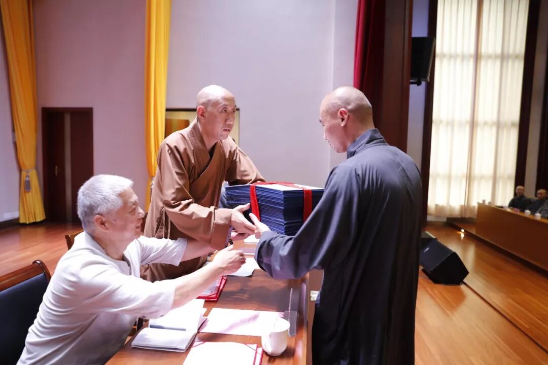 院长怡藏大和尚与在座学院领导、受邀嘉宾一道为获得优秀毕业生奖的学僧颁奖,并亲自为学僧颁发毕业证书。随后,怡藏大和尚主要从“八正道培养初心”、“三根本烦恼”等方面慈悲开示,并在勉励毕业生时提出了这样的希望和期许:“今天你们毕业了,但毕业不代表学习的终结,而是人生路上知行一如、学修并重的开始。我希望你们,能以毕业为起点,在以后的学修生涯中,爱国爱教、不忘初心,时时记得学无止境、行无止境,在以后的学佛道路上更加的勇猛精进,敢于担当,积极投身弘法利生的伟大事业中,为佛教的发展贡献出一份力量。你们是国家的公民,是新时代中国特色社会主义建设和中华民族伟大复兴事业的参与者”。毕业生代表也在发言中向在场院领导及法师表达了2019届预科班全体学僧的道心和志向的同时,也准备了精美礼品来表达对于学院悉心培养和关爱教育的感恩之情。
