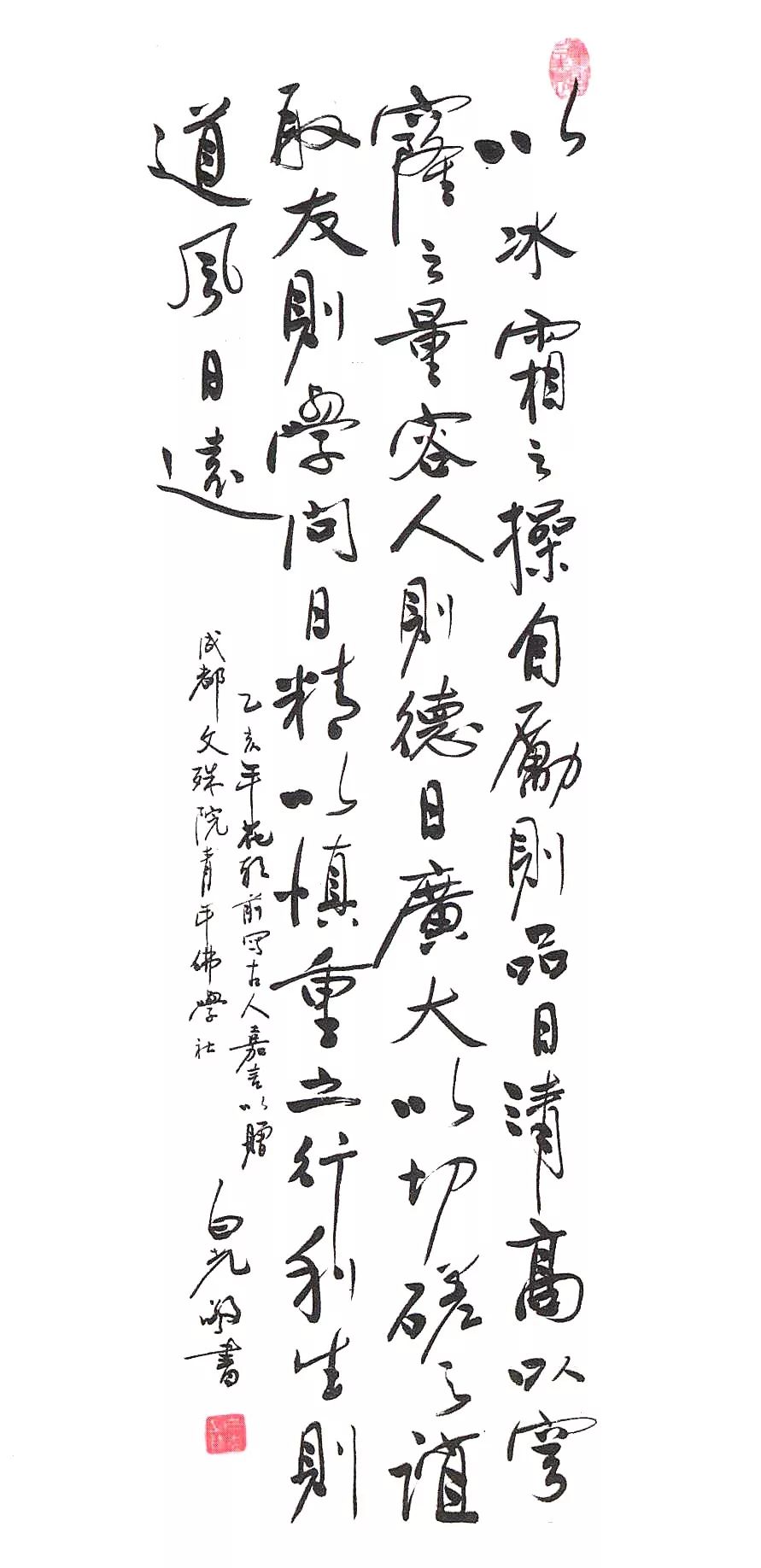 1997年12月,他从普陀山回京,一天我去他的寮房,向他倾吐了我内心的不安,因为还有半年就要毕业了,不知道毕业以后干什么合适,他听了以后,对我讲了一句话,“船到桥头自然直”。第二天,他给我一副亲笔书写的对联,对联的内容是:“莫为物累淡泊以处,捨却尘劳宁静而安。”我当时虽然没有深刻的领会这两句话的内涵,但感受到他对我的悉心关怀,内心也就没有了那份浮躁,安静了许多。