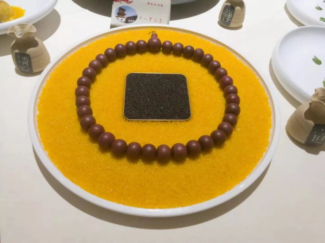 这道以玉米粉、面粉和可可粉杂糅而制作的“佛珠”菜品,其形静心去烦,其味香稣回甘,既有药食之功效,更具药食之精巧,赋予普通食材以完美的艺术价值。