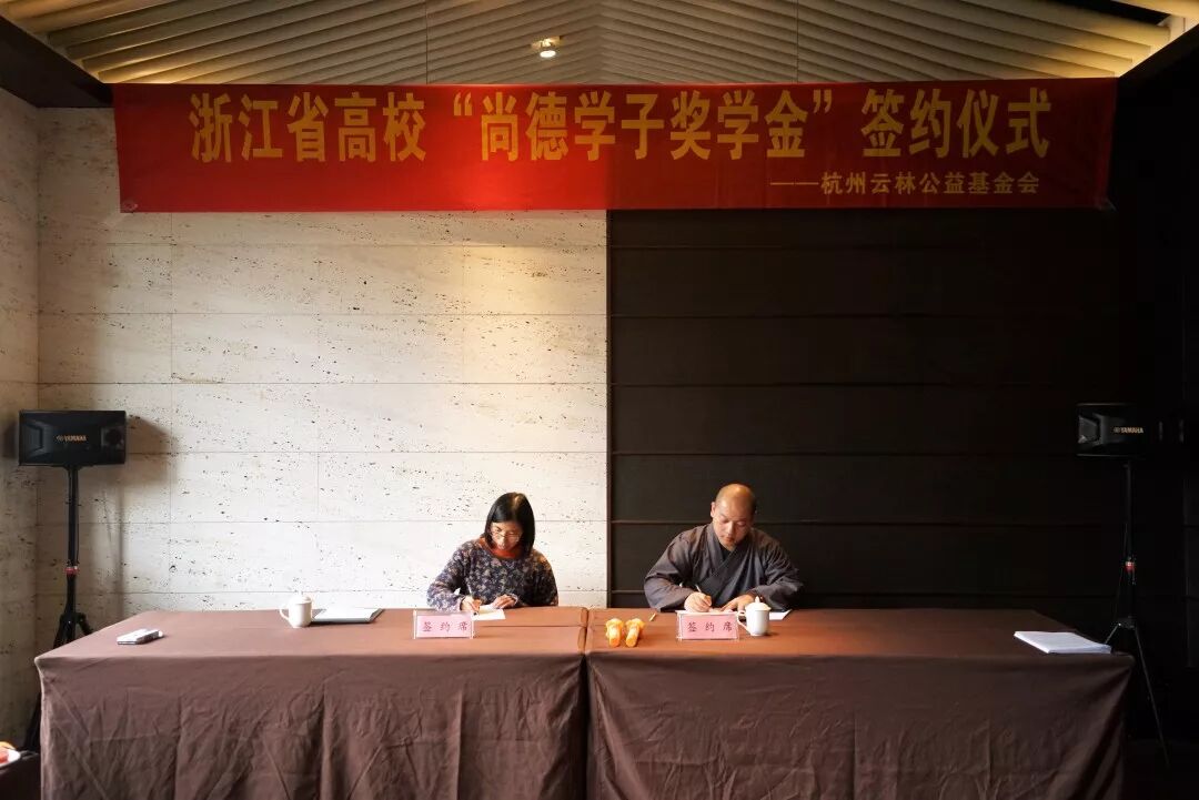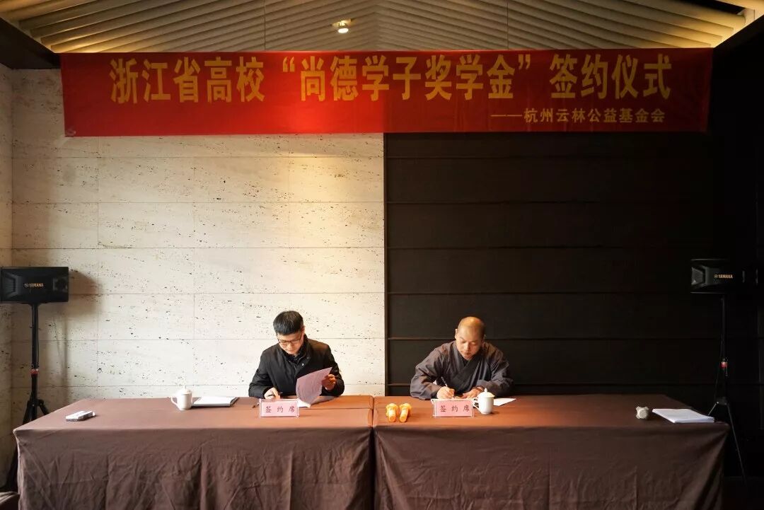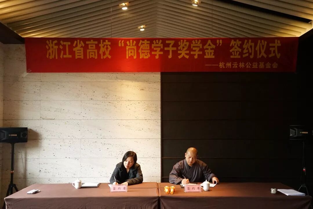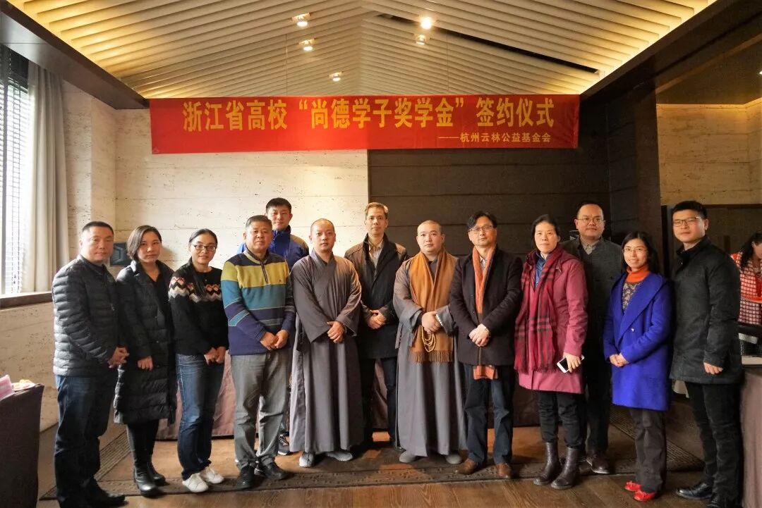 2018年12月13日,杭州云林公益基金会举行了浙江省高校“尚德学子奖学金”签约仪式。杭州市民族宗教事务局宗教处处长胡胜军、杭州灵隐寺监院智光法师、杭州云林公益基金会常务副理事长圣贤法师以及浙江大学、浙江工业大学、杭州电子科技大学等8所高校的代表出席了签约仪式。杭州云林公益基金会分别与浙江大学、浙江工业大学、杭州电子科技大学、浙江理工大学、中国计量大学、浙江农林大学、浙江传媒学院、浙江水利水电学院共8所高校签署协议,设立浙江省高校“尚德学子”奖学金。杭州市民族宗教事务局宗教处处长胡胜军在讲话中充分肯定了杭州云林公益基金会在赈灾济困、安老扶幼、扶贫帮困等方面的公益慈善事业中作出的贡献。他指出,在高校设立“尚德学子”奖学金对于激励当代大学生勇于承担社会责任、热心社会公益、关注弱势群体等具有积极的导向和示范性作用。胡处长还针对奖学金项目的发展提出了三点指导性意见,期望该项目带动更多的大学生投身社会公益,创造更高的社会价值。杭州云林公益基金会常务副理事长圣贤法师在发言中说到,云林公益基金会从2016年开始在浙江省高校设立“尚德学子”奖学金,期间获得奖学金的团体及个人的事迹都非常优秀、感人,说明在高校设立以鼓励大学生关爱社会、崇尚德行为导向的“尚德学子”奖学金是有意义的,也是比较成功的。经过两年的探索,项目运作机制渐趋成熟,签约学校由原来的4所增至8所。圣贤法师还对奖学金评审工作付出精力的学校与老师表达了诚挚感谢。杭州电子科技大学学生处副处长马宝龙在讲话中感谢了杭州云林公益基金会关注高校的改革发展、关心高校学子的健康成长。他表示,将做好奖学金的评选工作,让同学们养成感恩、回报社会的价值观。浙江大学教育基金会副秘书长顾玉林代表本次新签约学校做了发言。他说到,当代高校以培养“德、智、体、美、劳”全面发展的学子作为基本宗旨,而德育始终贯穿于教育的各个环节。杭州云林基金会设立“尚德学子”奖学金是非常可贵的,具有积极的导向性作用,能更好地促进社会正能量的弘扬。最后,来自各大学的老师们各抒己见,就如何制定“尚德学子”奖学金评选细则、完善评选标准与机制、培养学生公益团队等话题,进行了充分的交流与探讨,对奖学金项目的后期运作与实施,提出了很多宝贵的建设性意见。