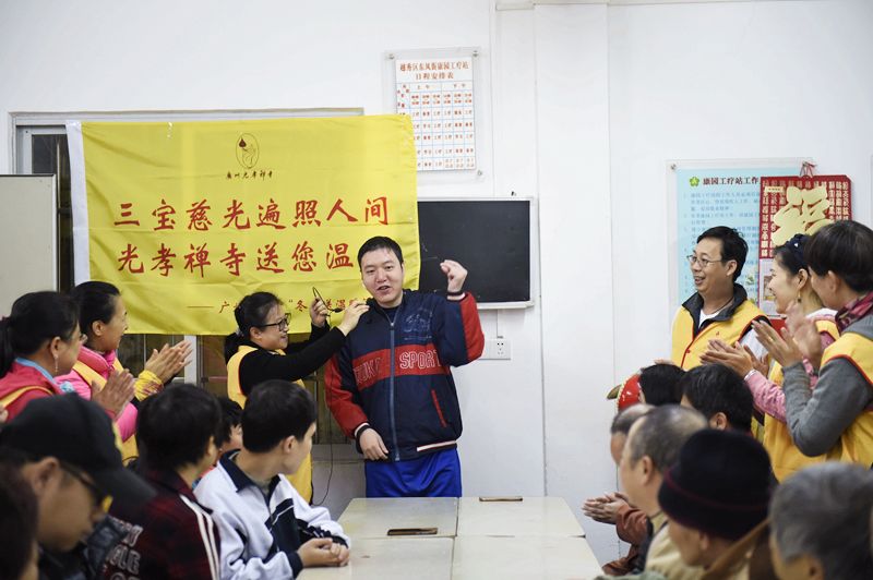 2018年12月28日,我寺举行“迎元旦,送温暖”社区慰问活动,光孝寺菩提义工团一行十余人带着大米、食用油以及鲜花等生活物资和节日礼物,先后前往越秀区东风西康园工疗站、六榕街环卫站、越秀区侨颐园养老院,慰问残疾人、环卫工人和长者们,为他们送上节日祝福,并进行游戏互动与关爱谈话,倾听他们的心声。