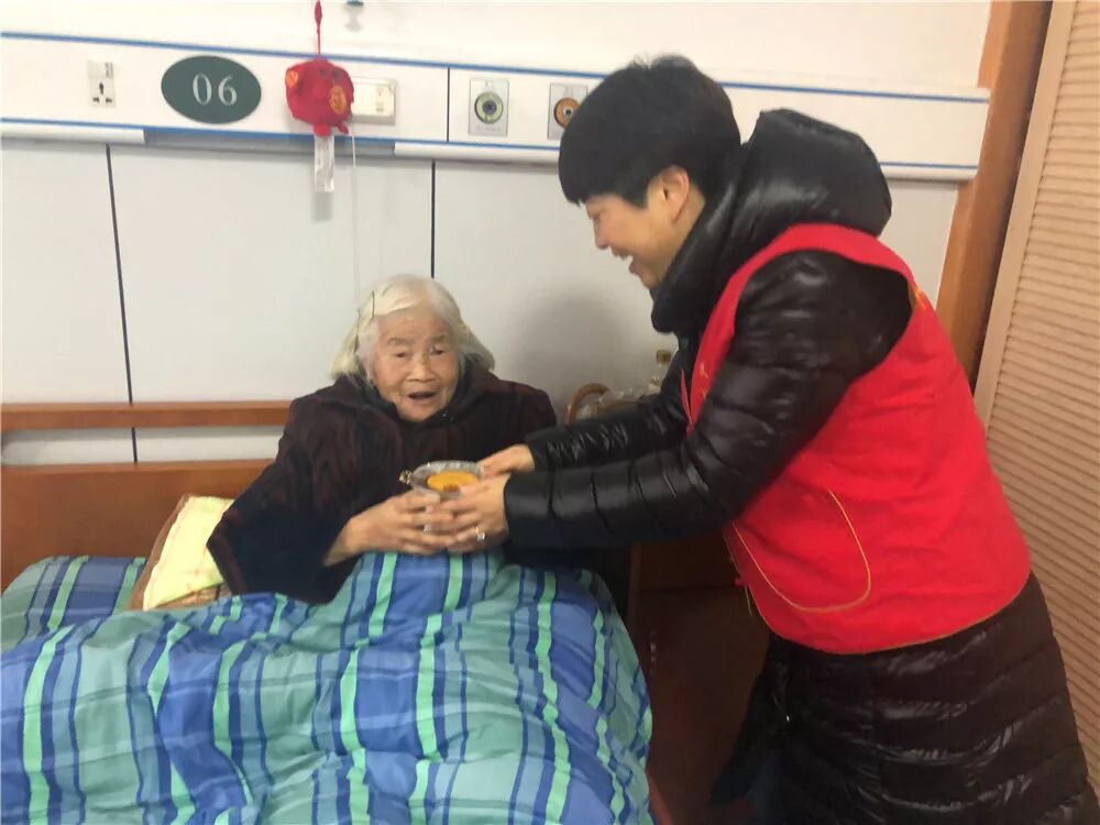 转塘敬老院的老人们,有的还躺在床上。志愿者们一个个房间来回穿梭,把腊八粥送到每一位老人手里。