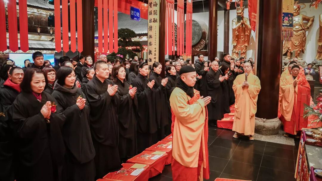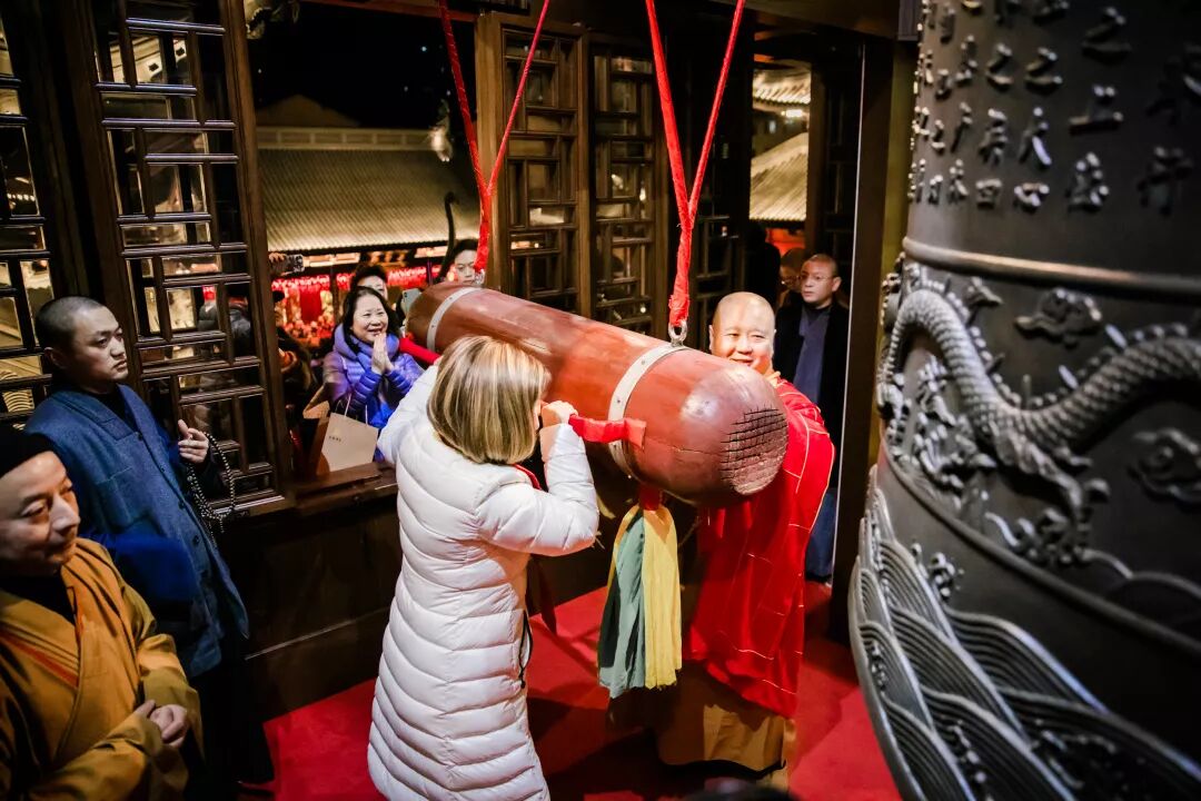 温暖除夕夜——上海社会各界迎新春慈善晚会结束后,上海玉佛禅寺照例举行了传统的撞钟迎新仪式,108响梵钟,代表108声祝福。觉醒大和尚带领护法居士、十方善信依次撞响吉祥钟,吉祥的钟声传递着上海玉佛禅寺对社会大众的真诚祝愿,共同祝愿祖国强盛、世界和平、风调雨顺、社会祥和、人民安康。