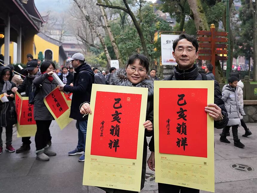 还有祈福年历,灵隐寺方丈光泉法师,每年新年来临之前,都会亲手题写,制作祈福年历送给大家。这已经成了杭州人最喜欢的吉祥跨年礼。